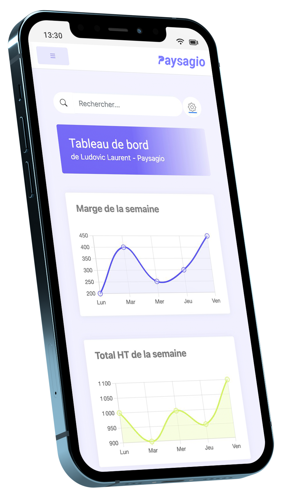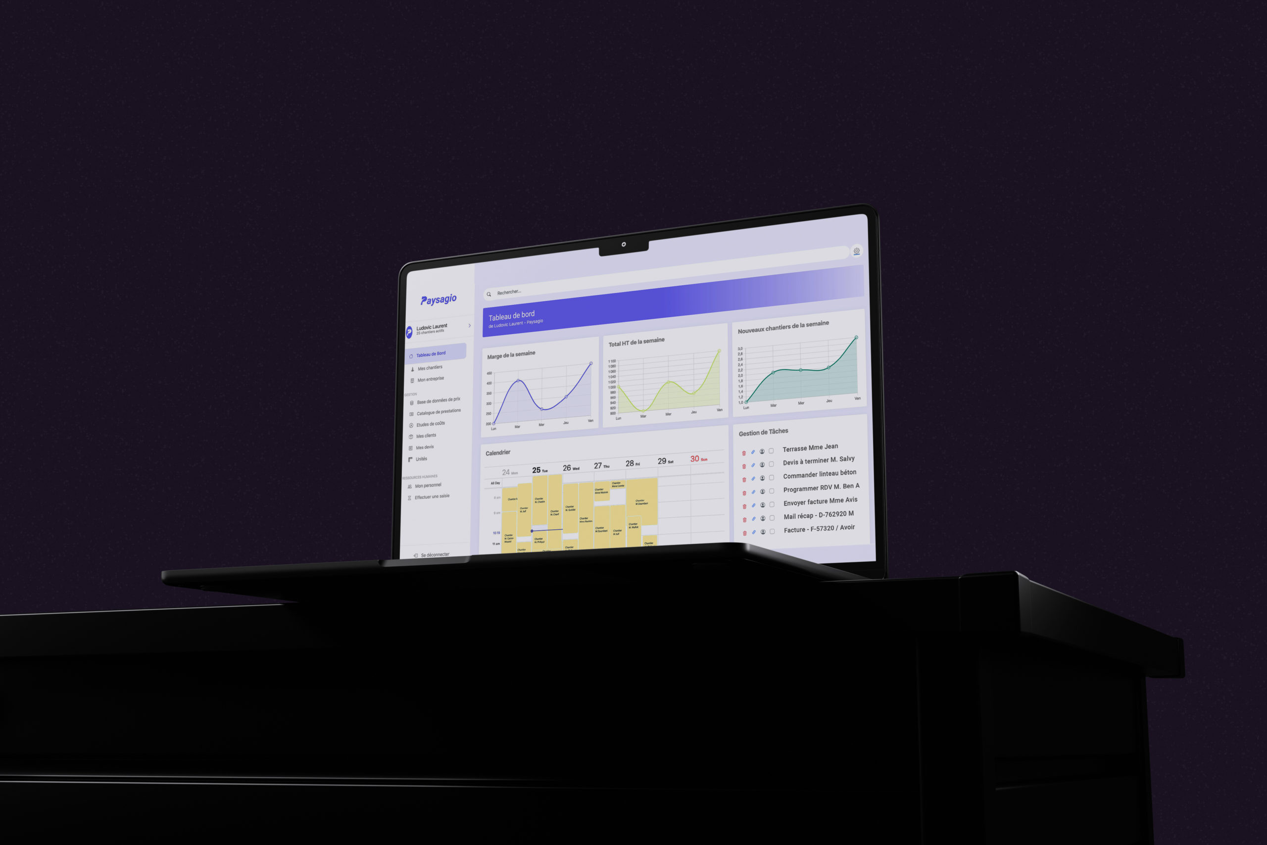 Marge de la semaine, CA HT, nouveaux chantiers, agenda partagé, to-do, chantiers actifs.