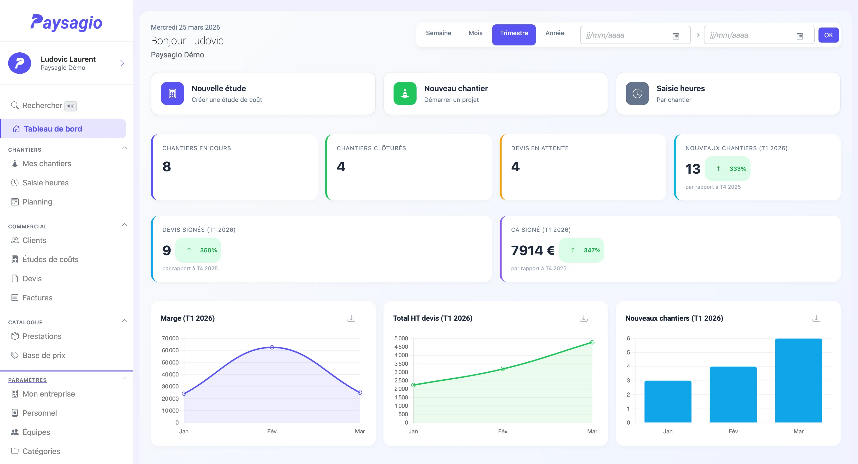 Tableau de bord Paysagio — vue d'ensemble de l'activité